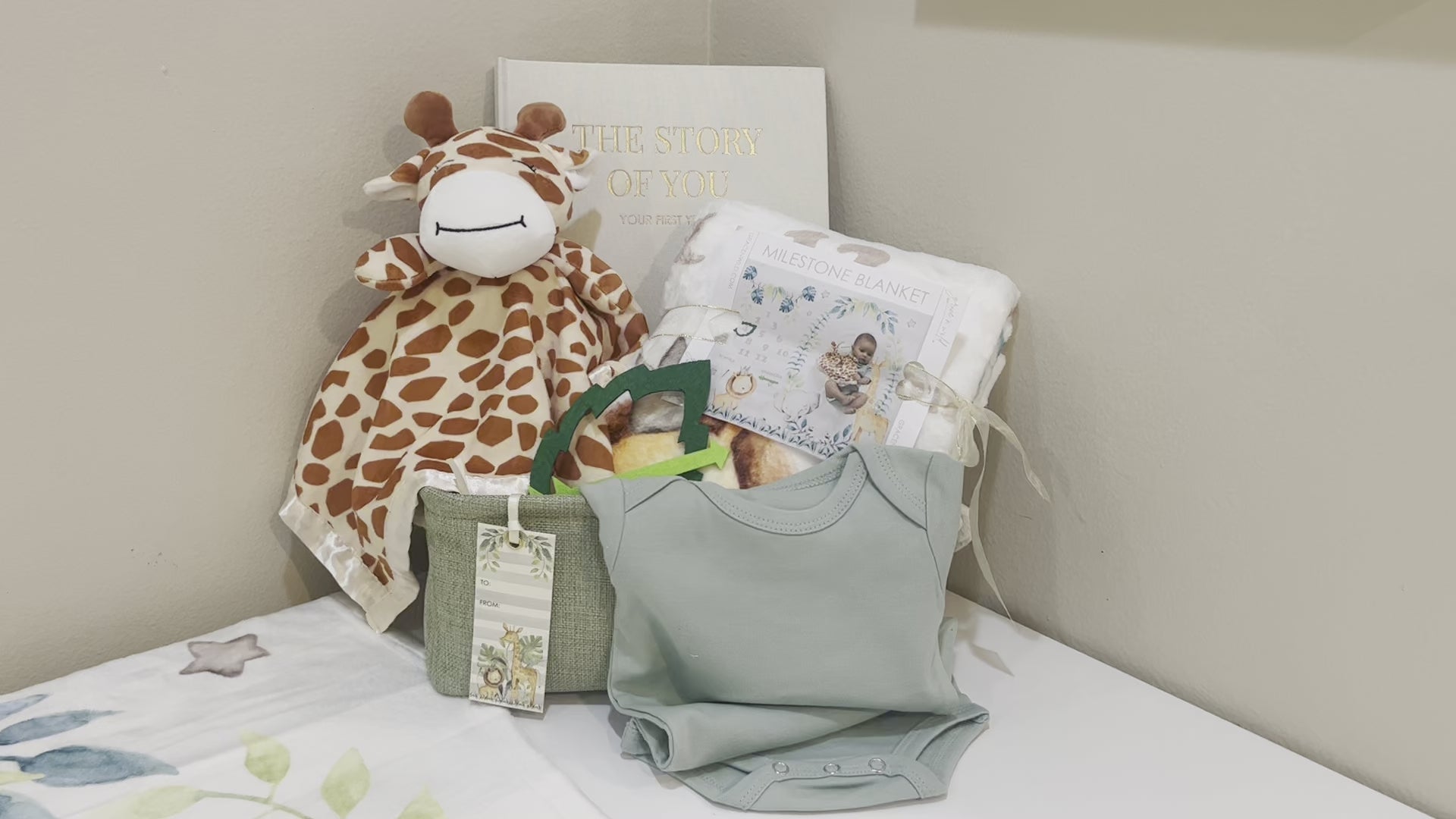Introducing our Wildlife Wonders Safari Animals Milestone Gift Basket -from their first roar to their first steps, this basket captures the essence of adventure, discovery, and growth as your little one embarks on their own safari through life. Whether you're welcoming a new addition to the family or attending a baby shower, this thoughtfully curated gift basket is sure to bring joy and create lasting memories.