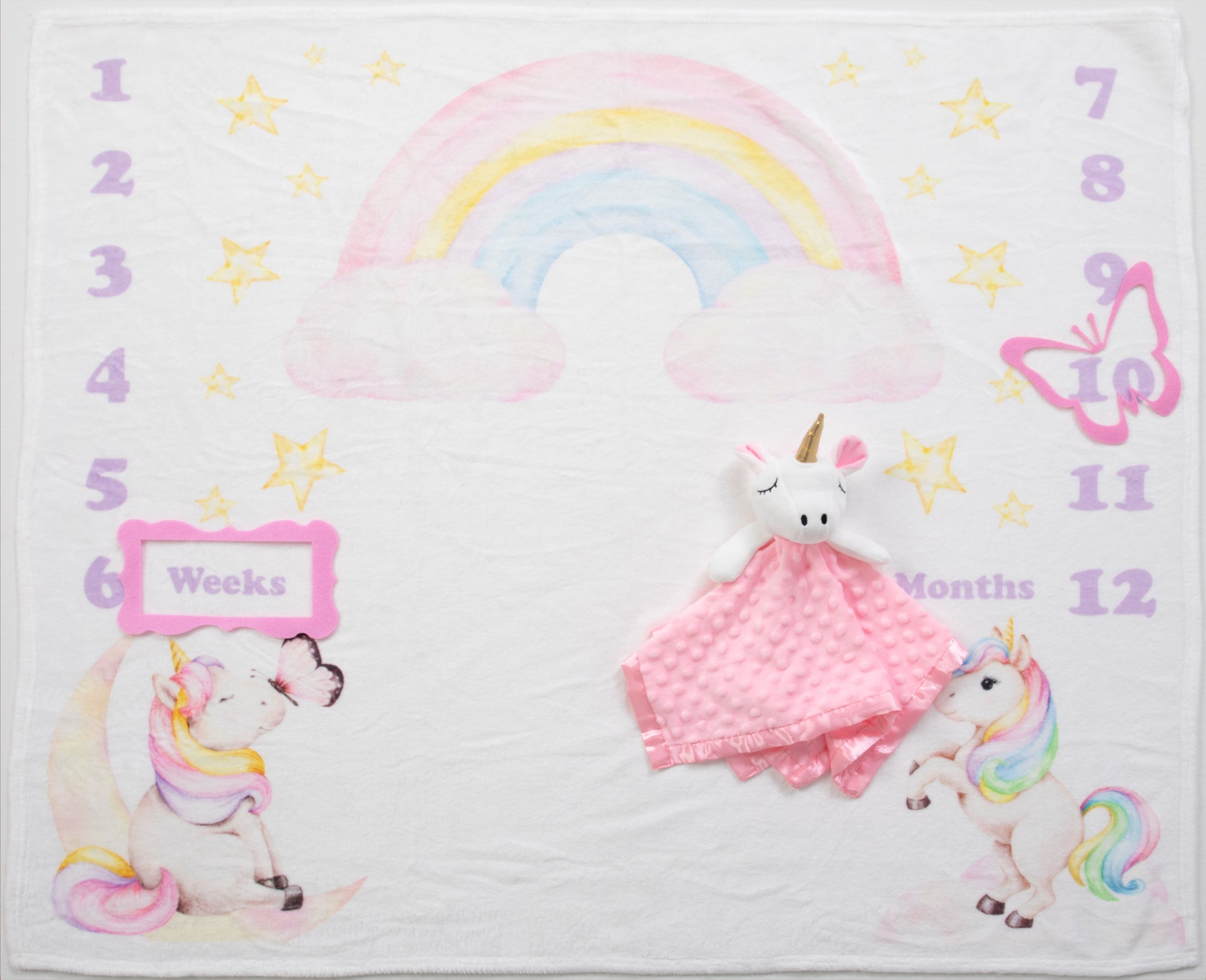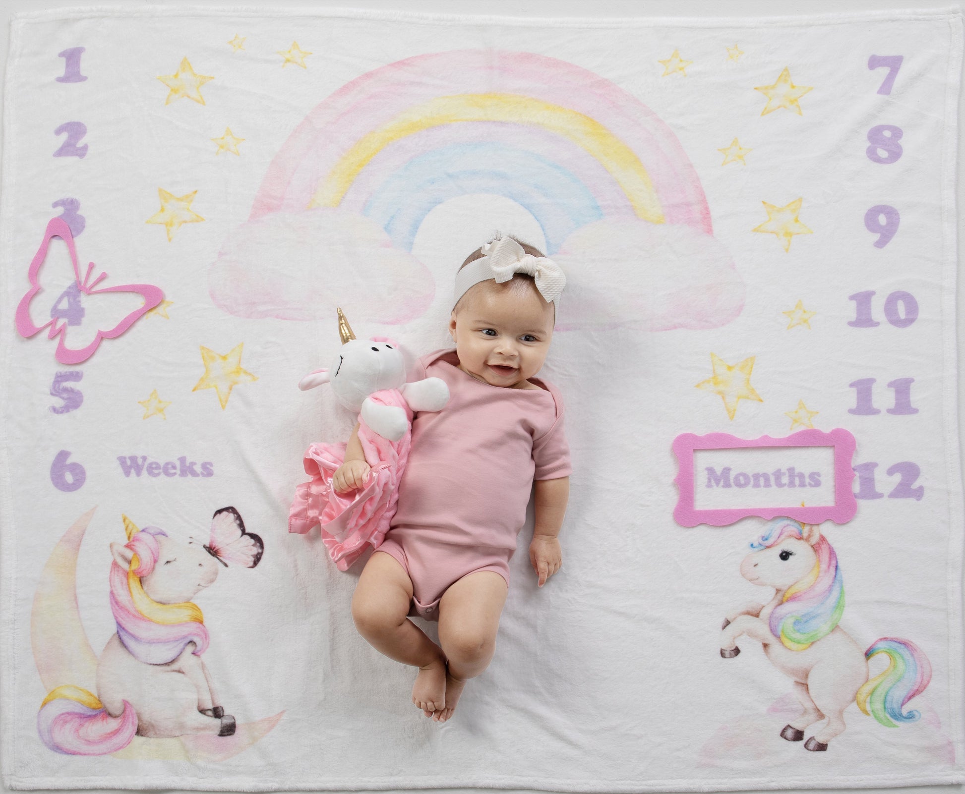 Milestone Blanket: Capture the magic of your baby's growth with our soft and adorable magical unicorn and rainbow milestone blanket. Crafted from plush, high-quality material, this blanket features a whimsical rainbow with unicorn friends and butterfly design that makes it perfect for monthly photo sessions. Watch your little one grow, and create a heartwarming keepsake of their first year.